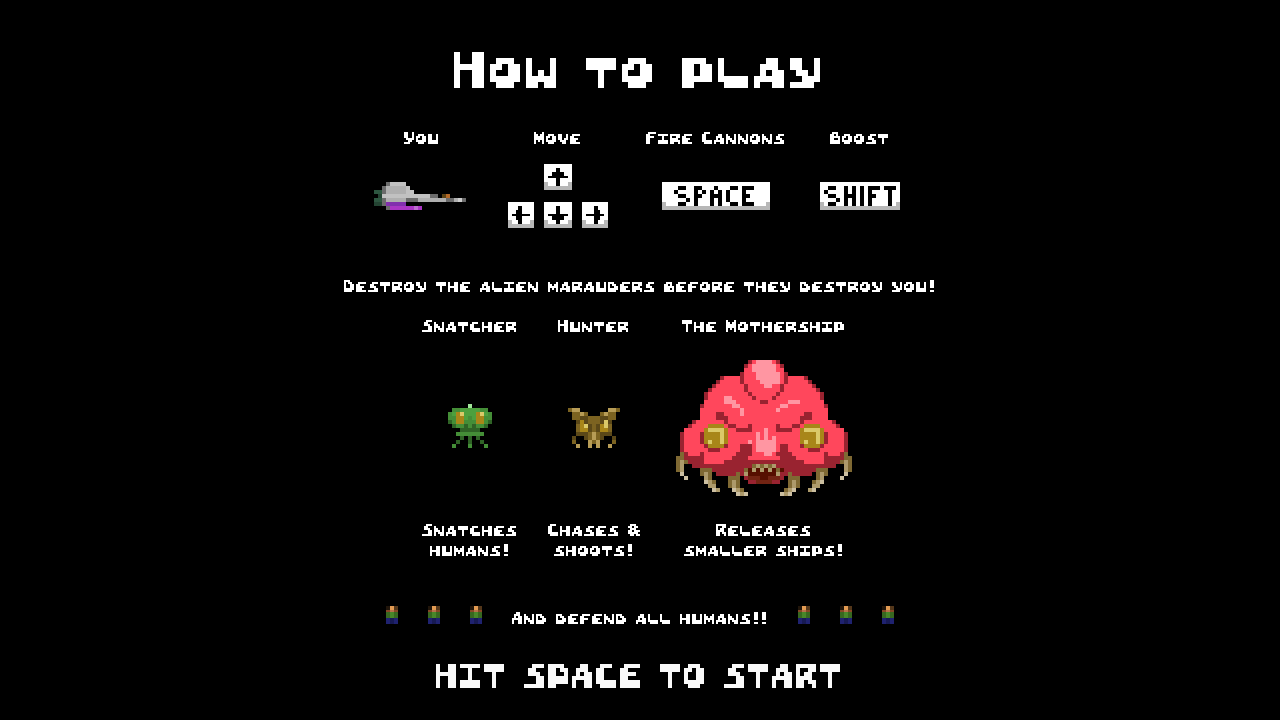 The alien marauders have arrived in the skies over the Earth, and you are inexplicably the only one who can stop them from stealing all of the humans! Use your super-advanced fighter jet to stop them, and